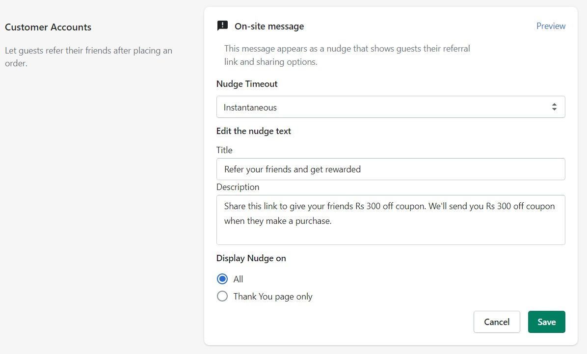 You can easily customize the text displayed to customers and preview your changes. The timeout for the nudge can also be adjusted. You can also choose to display the nudge on all pages of your site or just the thank you page.