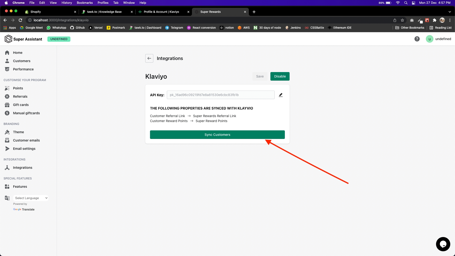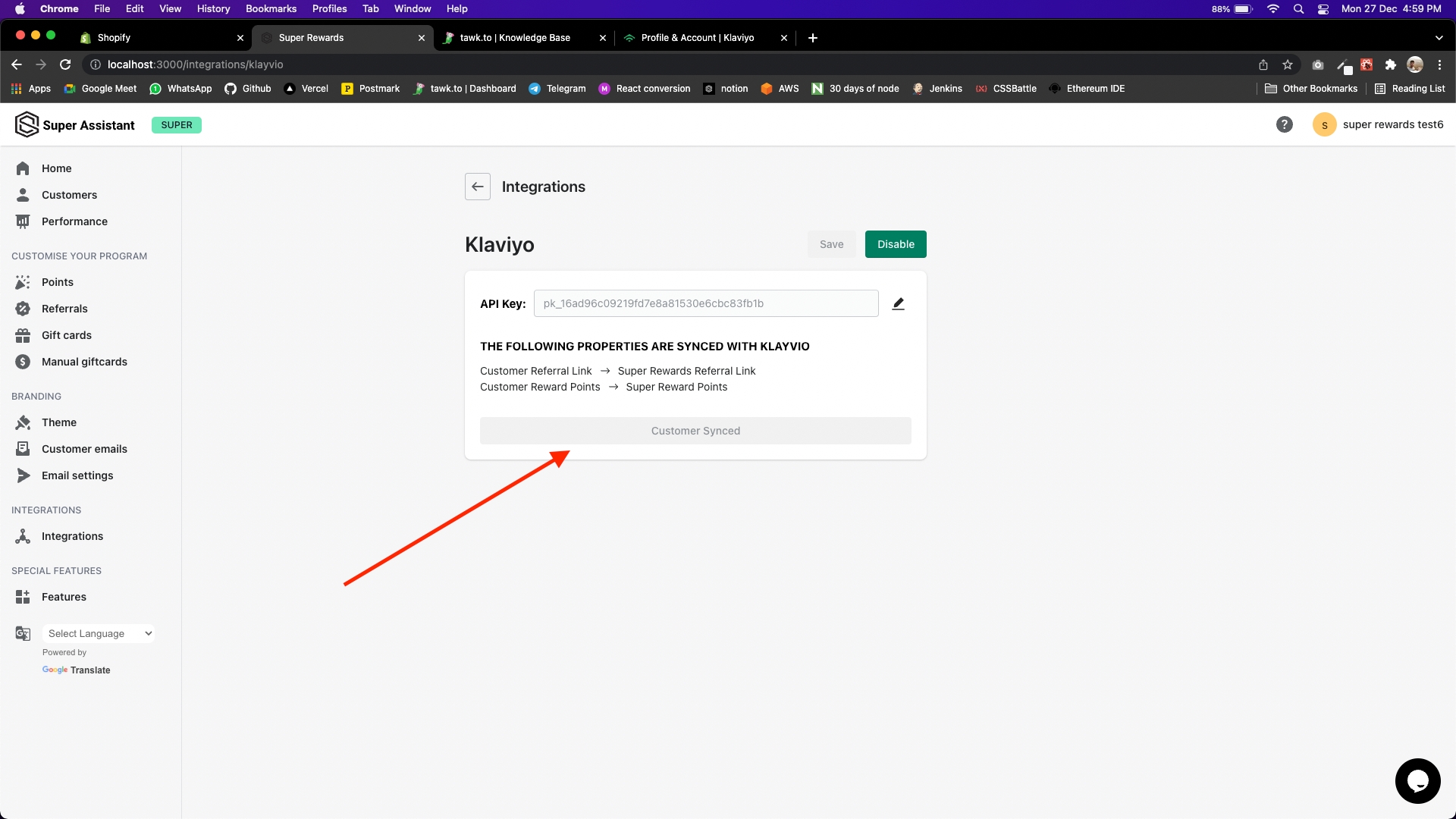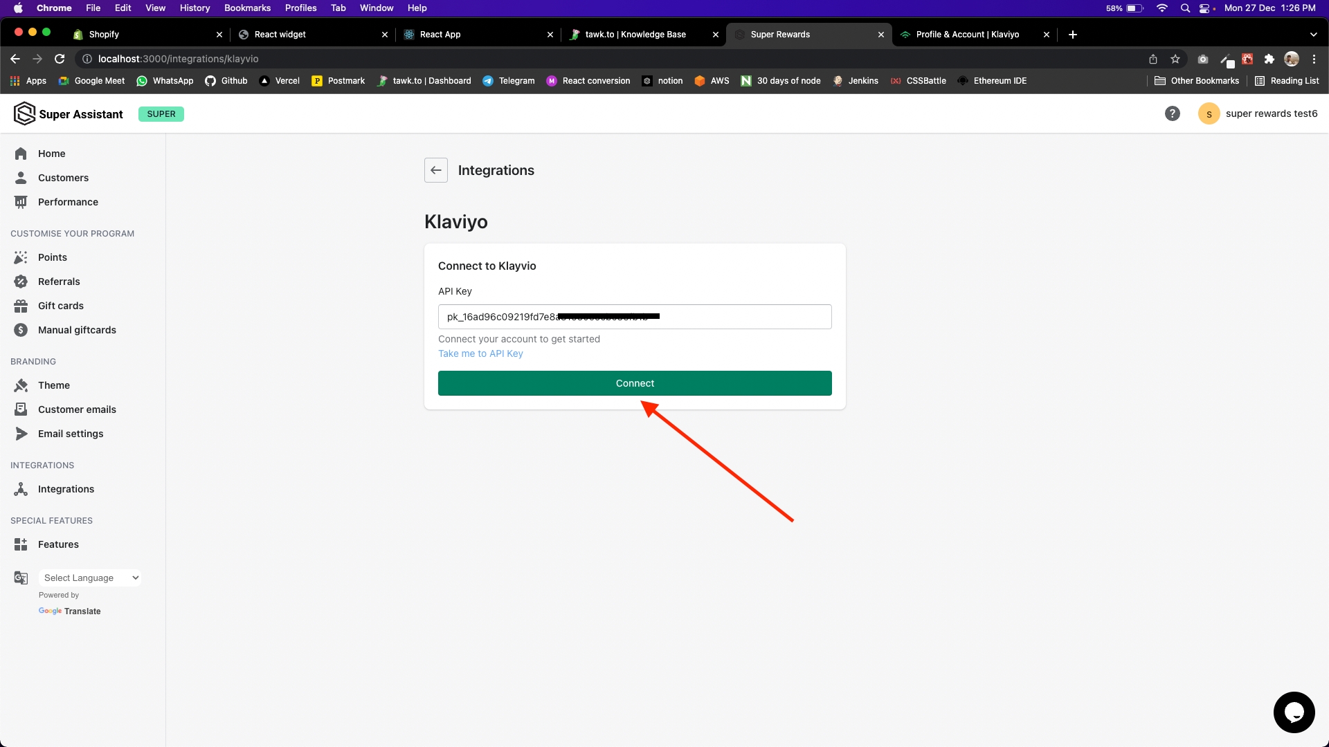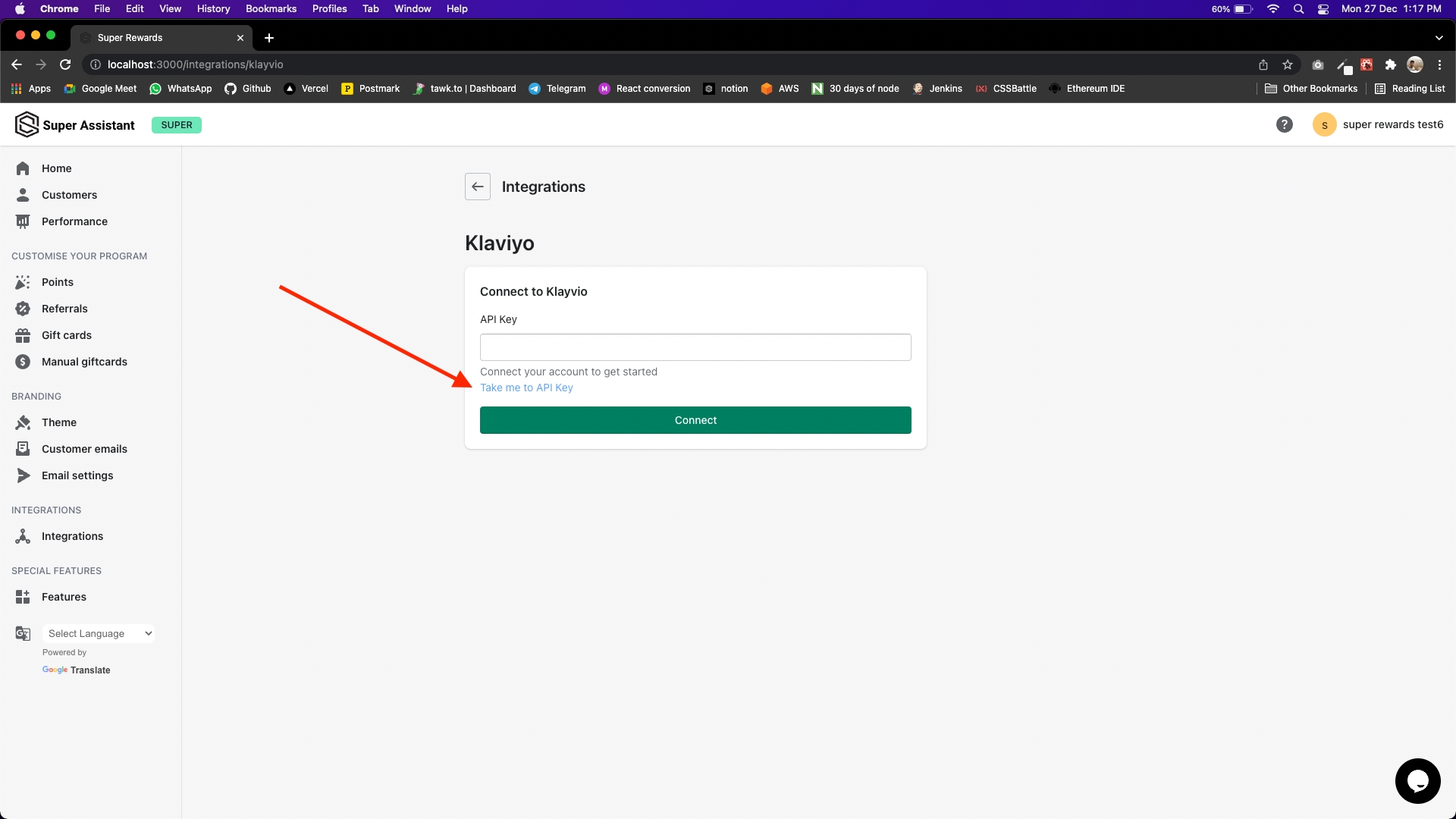 Copy the API Key, and go back to super rewards dashboard.